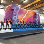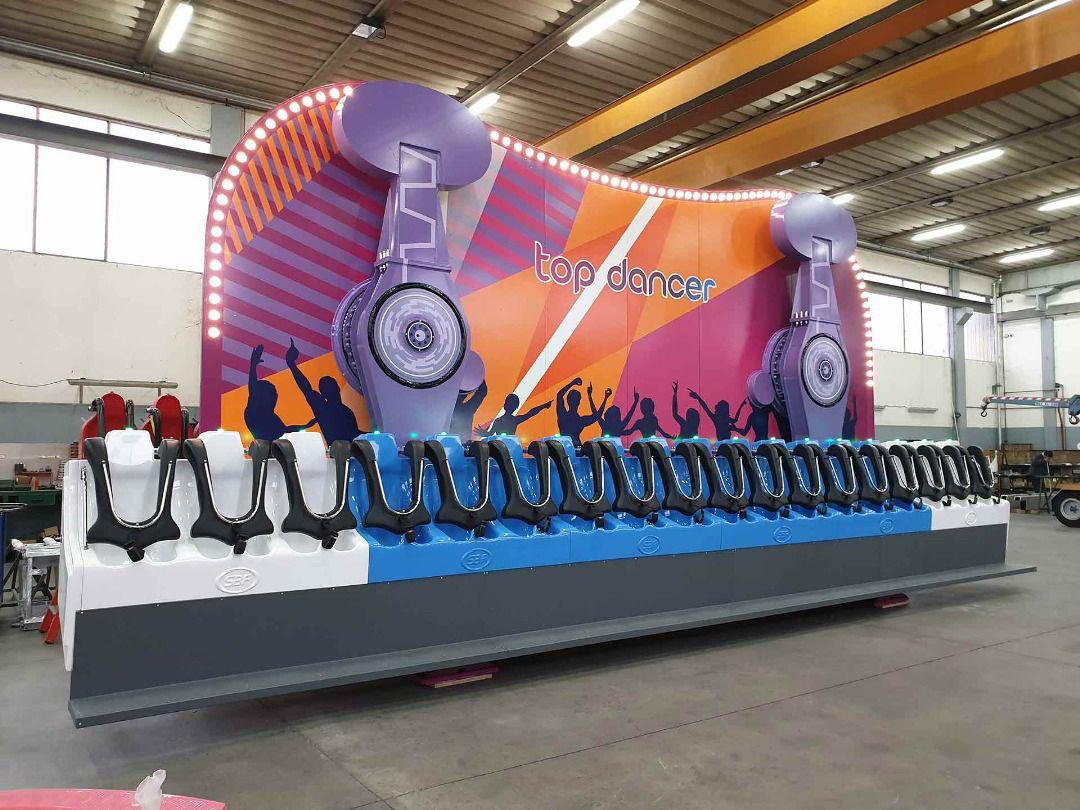 Top Dancer consists of a row of seats rotating clockwise and anticlockwise in a vertical circle by two arms.